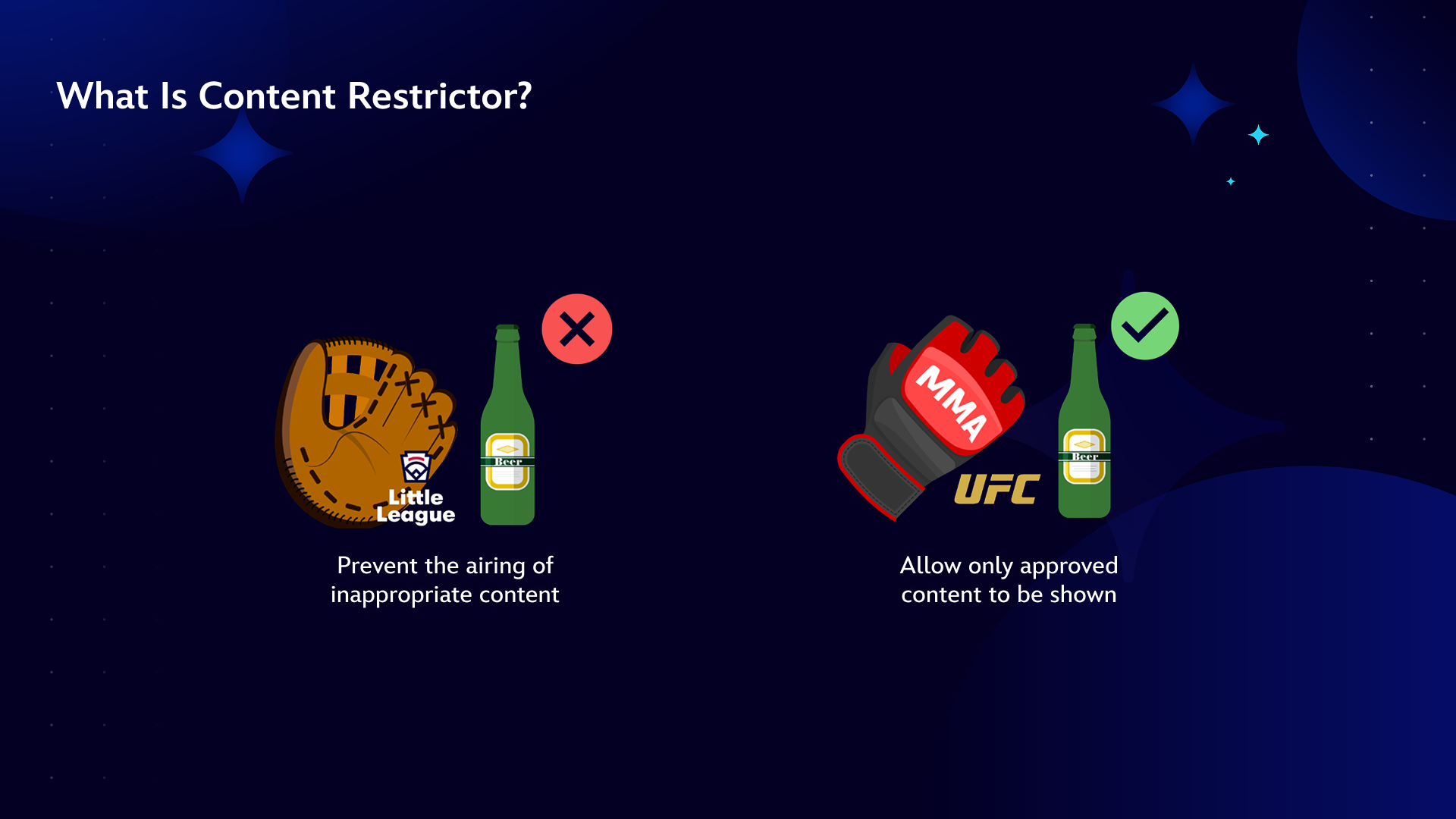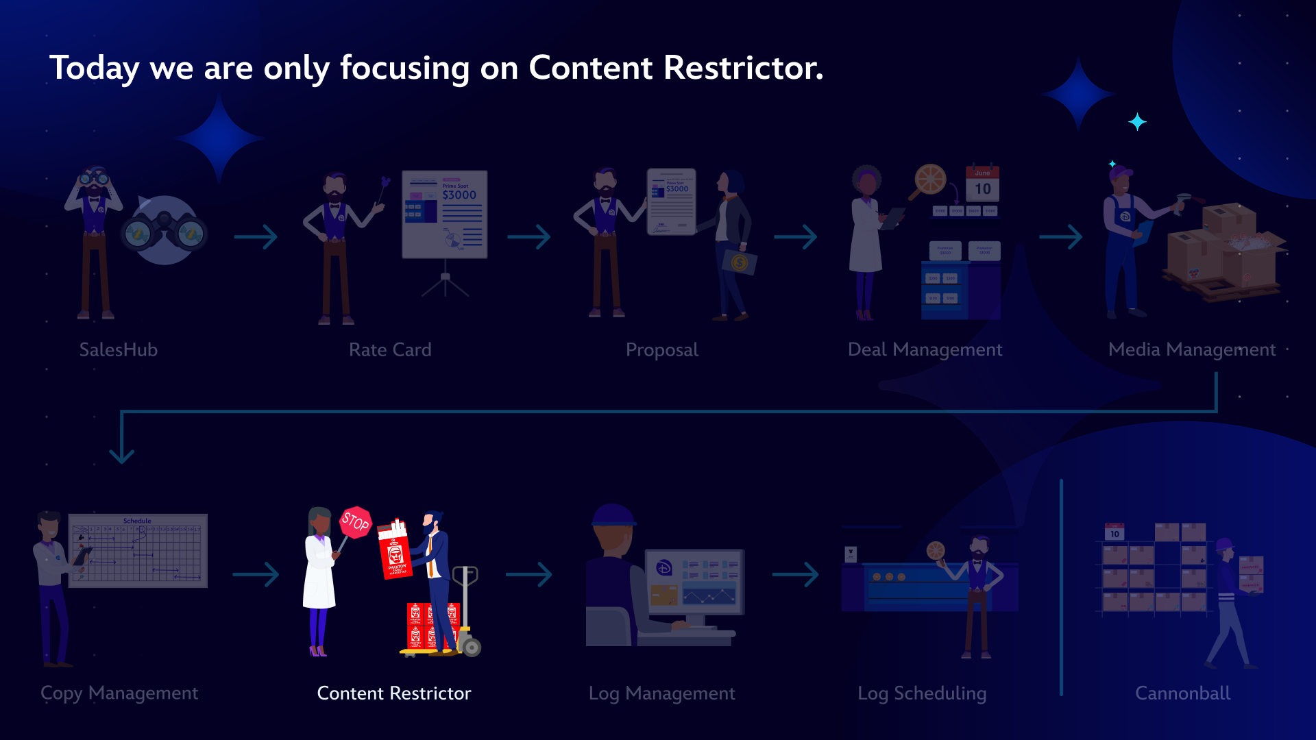 Content Restrictor is an enterprise application that’s a segment of a broader suite of workflow apps called AdVisor, that helps programming content managers to create rules that prevent certain ads from airing during certain TV programs.